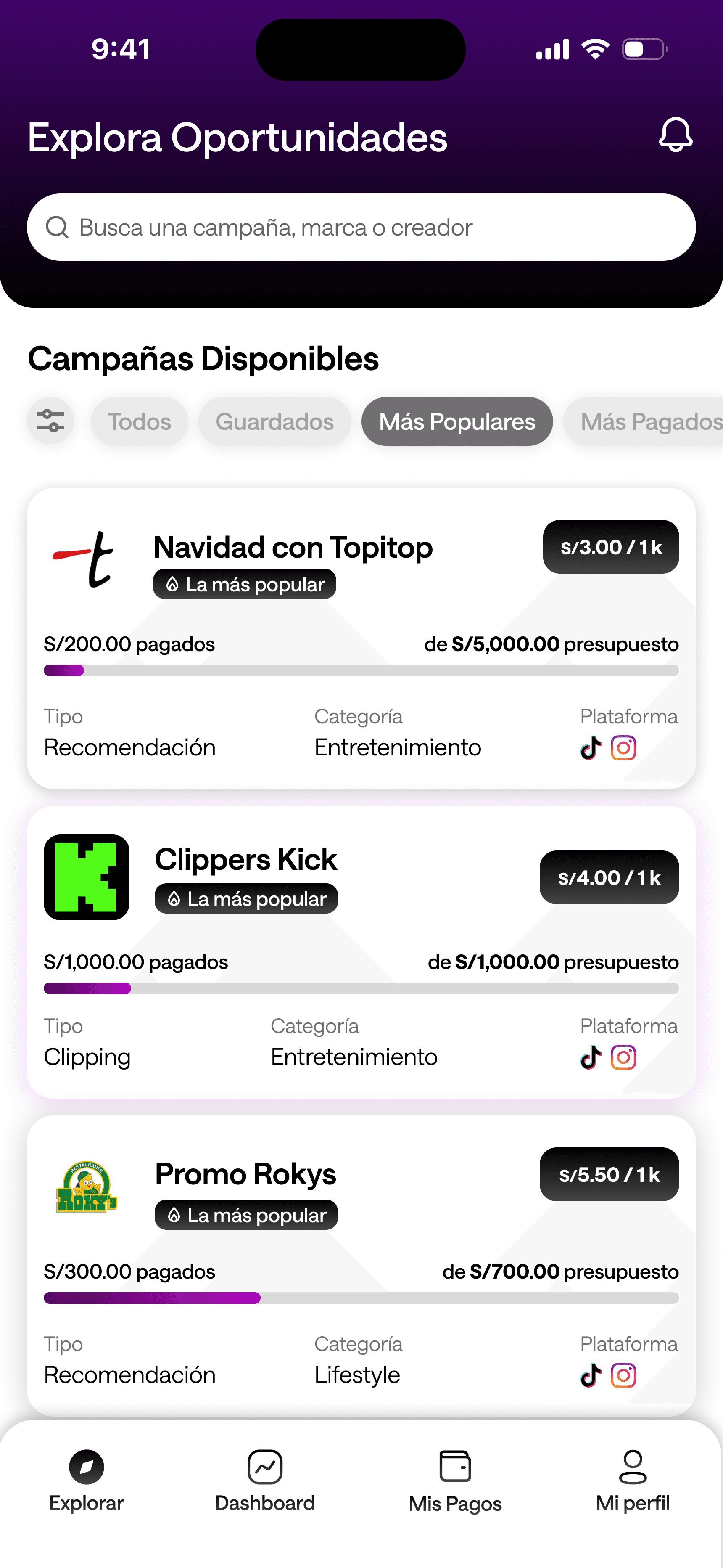 Ten acceso a todas las campañas y empieza a crear contenido de valor para marcas y streamers
