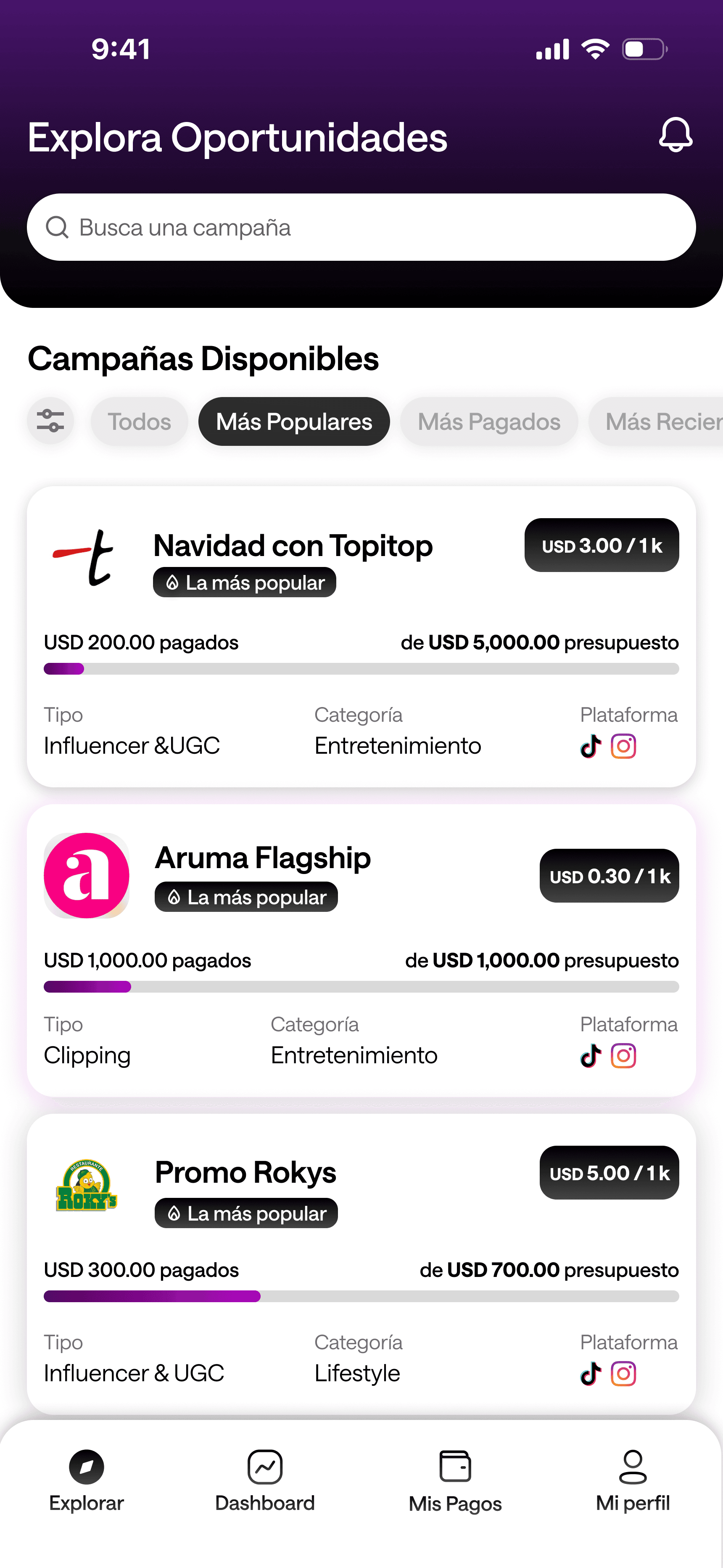 Las marcas publican, tú compras y grabas, y cobras por los resultados. Así de directo.
